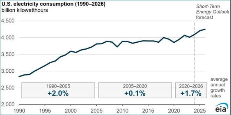 America is experiencing a surge in electricity demand thanks to the rise of artificial intelligence, domestic manufacturing and electrification. The U.S. Energy Information Administration (EIA) expects U.S. electricity consumption to increase nearly 10% between 2020 and 2026 (1.7% annual growth). In the first quarter of 2025, AEP alone saw its commercial power load grow 12.3%, which illustrates the magnitude of the surge driven by increased demand.